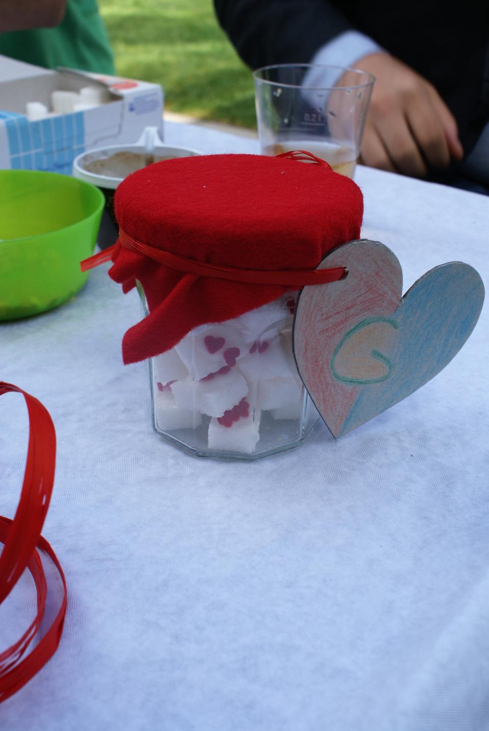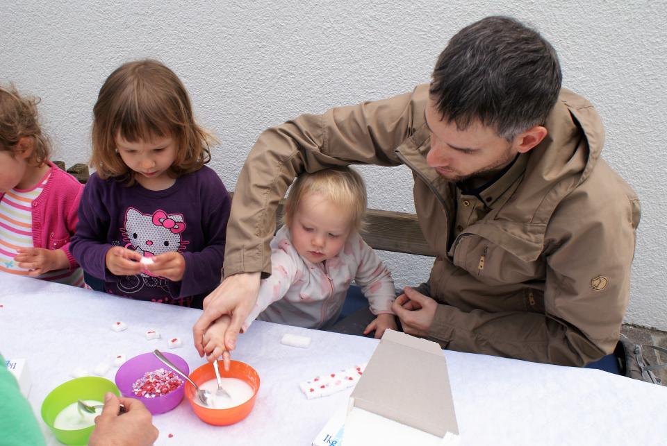 Die Väter oder stellvertretend auch das Grosi oder Gotti durften mit den Kindern das Muttertagsgeschenk basteln. Das Basteln fand in zwei Etappen statt. Wir hatten Glück mit dem Wetter und konnten der Kreativität im Garten freien Lauf lassen. Die Kinder brachten ein leeres Konfiglas mit und konnten dies mit Zuckerwürfeln füllen. Die Zuckerwürfel wurden zuerst noch mit viel Liebe dekoriert und wurden dann sorgfältig im Glas verstaut. Das Glas wurde mit einem Etikettenherz verziert und gut eingepackt. Zum Znüni gab es für alle Zopf und Kaffee und zum Zvieri einen feinen Apfelkuchen.