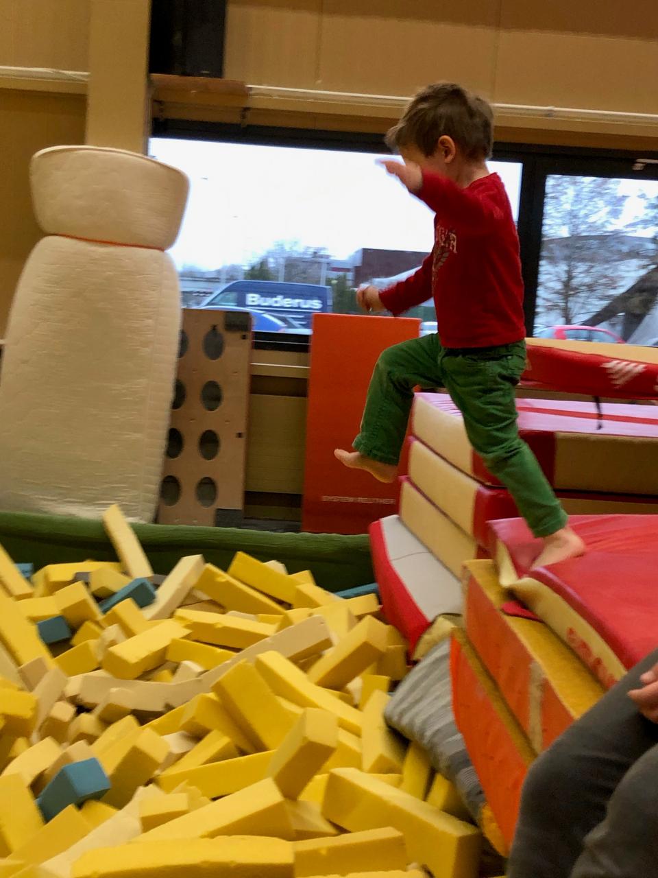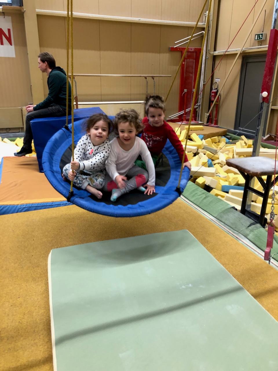 In Solothurn nahmen wir den Bus Richtung Schwimmbad und besuchten eine Sporthalle. Dort sind Kinder von 1-4 Jahren eingeladen sich frei in der Halle zu entfalten. Nach dem energiereichen Znüni gings los und die Kinder waren voller Freude die vielen Turngeräte auszuprobieren. Eines der Highlights war das lange Trampolin. Beim Springen in die Schaumstoffwürfel beweisen die Kinder viel Mut. Das Klettern auf den Barren forderte Geschicklichkeit und die Halle liess viel Freiraum zum Springen.