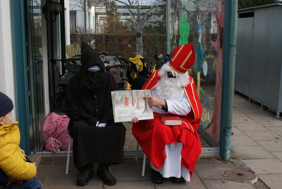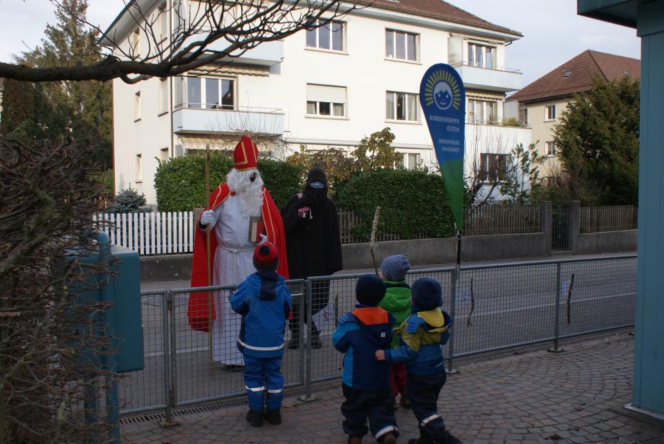 Nach einiger Zeit konnte man eine Glocke hören und der Samichlaus und sein Begleiter Schmutzli begrüssten die Kinder freundlich am Gartentor.