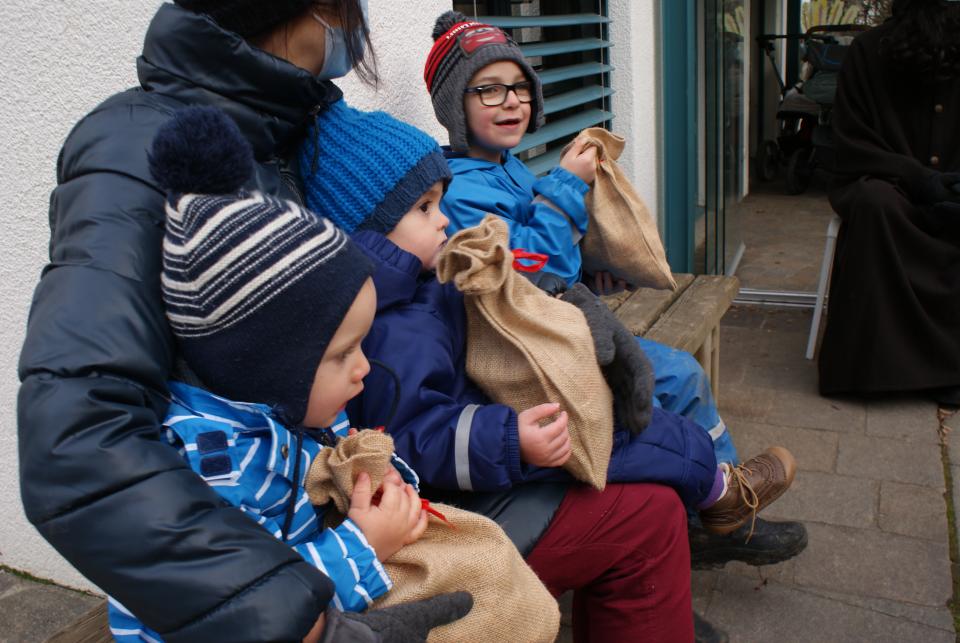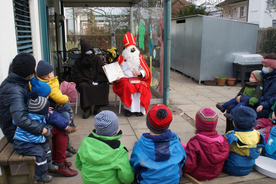 Mit Luftsprüngen, Fragen und doch ein paar kritischen Blicken wurde der Chlaus in den Garten gelassen. Gemeinsam setzen wir uns in einen Halbkreis und lauschten was der Samichlaus uns zu sagen hatte. Er erzählte uns die Geschichte von «Glisglis dem Siebenschläfer», der den Samichlaus unbedingt treffen wollte. Die Kinder hörten dem Chlaus aufmerksam zu und zum Schluss folgte noch die obligatorische Frage. «Wo isch denn s Eseli Samichlaus?». Der Chlaus erklärte uns, dass der Esel Angst vor dem vielen Verkehr hatte und somit beim Bauern ausserhalb der Stadt eine Rast einlegen dürfte.