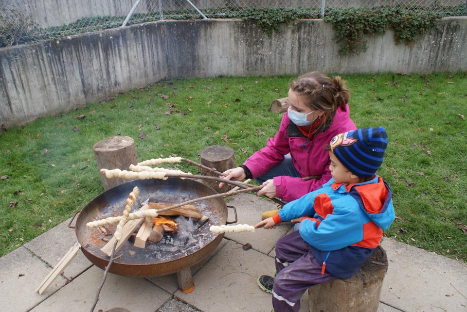 Jedes Kind half tatkräftig mit, das Feuer am Brennen zu halten und das Schlangenbrot braun werden zu lassen.