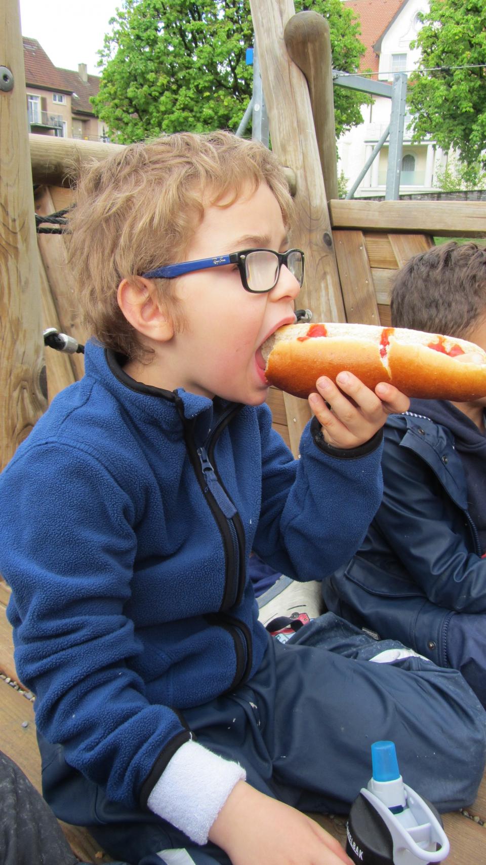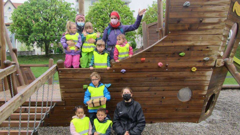 Mit Hilfe der Schatzkarte haben wir an der Aare, am Bahnhof, beim Gleis 13, bei den Samaritern und beim «Piratenspielplatz» (Trottermatte) Hinweise von Pirat Hinkebein gefunden, in welchen er uns seine Geschichte erzählte. Vor Ort fanden wir seine Schatztruhe, gefüllt mit süssen Leckereien. Nach eifrigen Spielen und das Schiff gegen das Seemonster verteidigen, durften wir selbstgemachte Hotdogs geniessen. Natürlich gabs zum Dessert etwas aus der Schatztruhe!