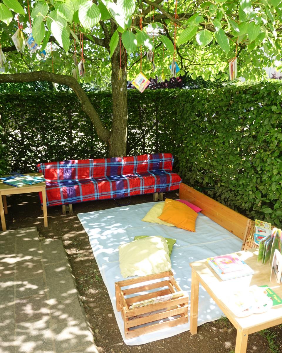 In einer Ecke hinter dem Haus gab es die Möglichkeit sich zurückzuziehen und Bücher anzuschauen, welche auch getauscht werden konnten. Spielsachen, welche zu Hause ausgedient haben, durften mitgebracht werden und konnten untereinander ausgetauscht werden.
