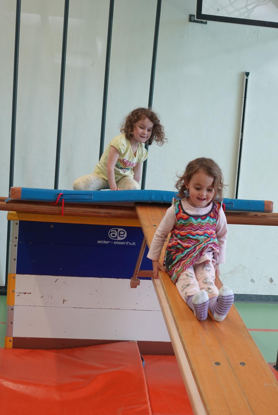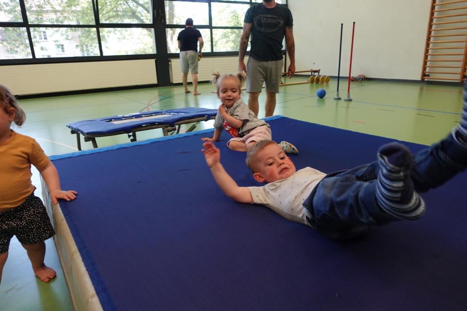 Am Samstag, 14.Mai lud die Kita zum Turnen in die Turnhalle der Schule Frohheim ein. Es waren verschiedene Geräte und Materialien zum Benutzen aufgebaut worden.