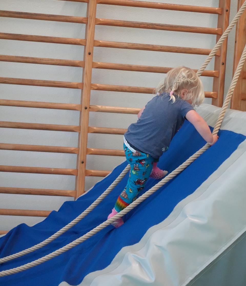 Viele Kitakinder mit ihren Eltern und Geschwistern balancierten, schaukelten, sprangen, kletterten und rutschten in der Turnhalle herum. Es gab einen Berg, auf den man mit Hilfe eines Seiles hinaufsteigen konnte. Danach hatten die Kinder die Möglichkeit über die Sprosswand auf die andere Seite hinunterzusteigen oder den Berg auf dem Po hinunterzurutschen.